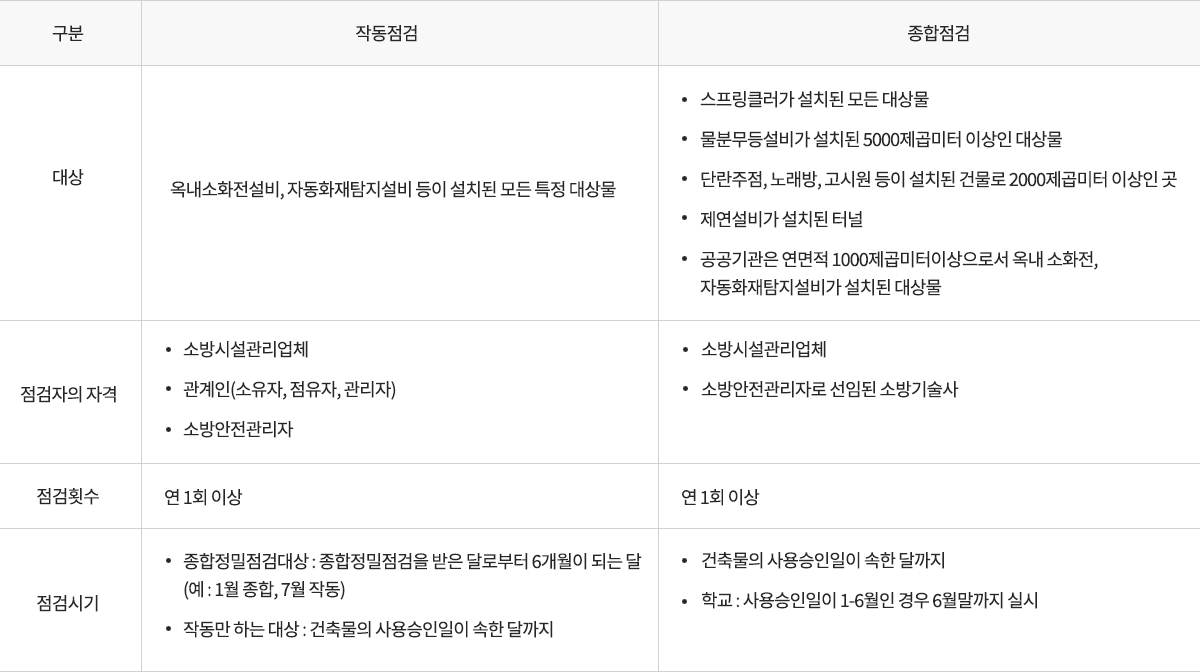 특정소방대상물의 관계인(소유자,관리자,점유자)은 소방시설등에 대하여 자체점검을 실시하거나, 소방시설관리업자에게 정기적으로 점검하여 하여야 합니다.